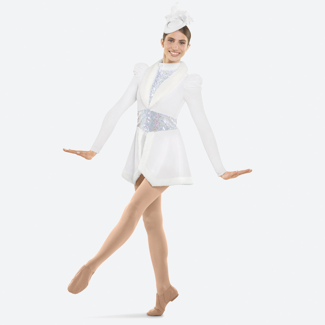 - Attached cutaway skirt edged in faux fur